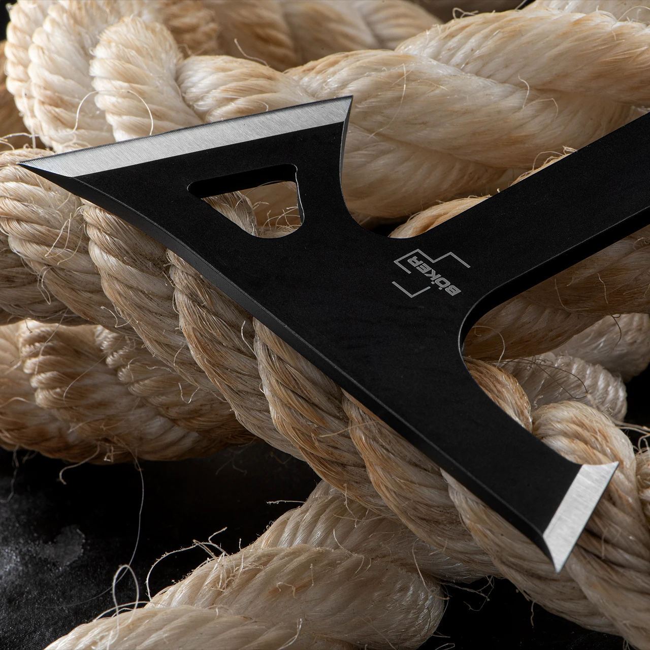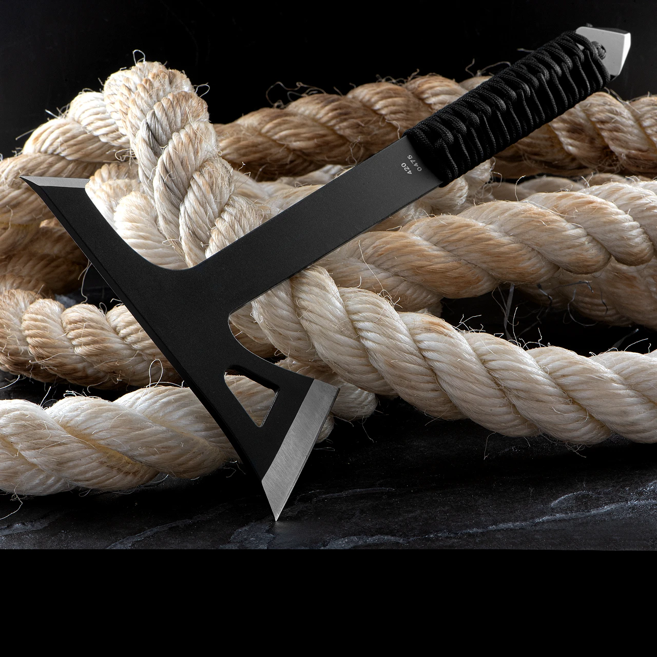The all-steel 3Cr13 stainless steel construction has a black coating. The shape of the axe is based on the silhouette of traditional tomahawks of North American indigenous peoples and features an additional, shorter cutting edge on the axe head. The paracord-wrapped handle, which is comfortable and safe to hold, ensures the necessary precision when throwing. The bell-shaped recess on the blade guarantees a good balance with even rotation. For the home advantage, the throwing ax set comes with a matching sheath and a printed target overlay.