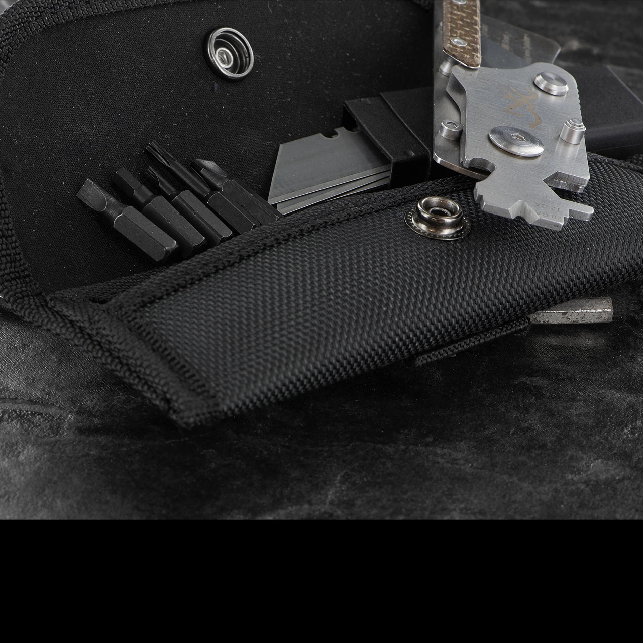 Features a utility knife with replaceable blades, five insert bits, 12/20 tube wrench. Nylon belt sheath included.