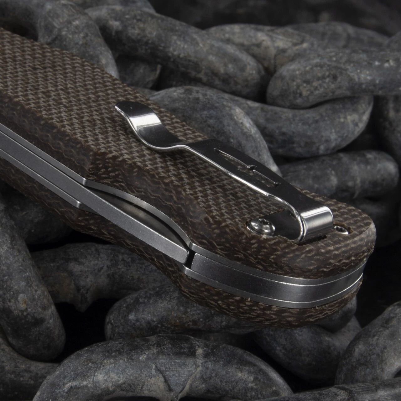 The Camillus Bushcrafter Folder is the knife built for long term use in the wilderness. The drop point blade is titanium bonded, the Micarta handle scales are removable with hex bits, the knife has a dual position belt clip and has a simple lockback.