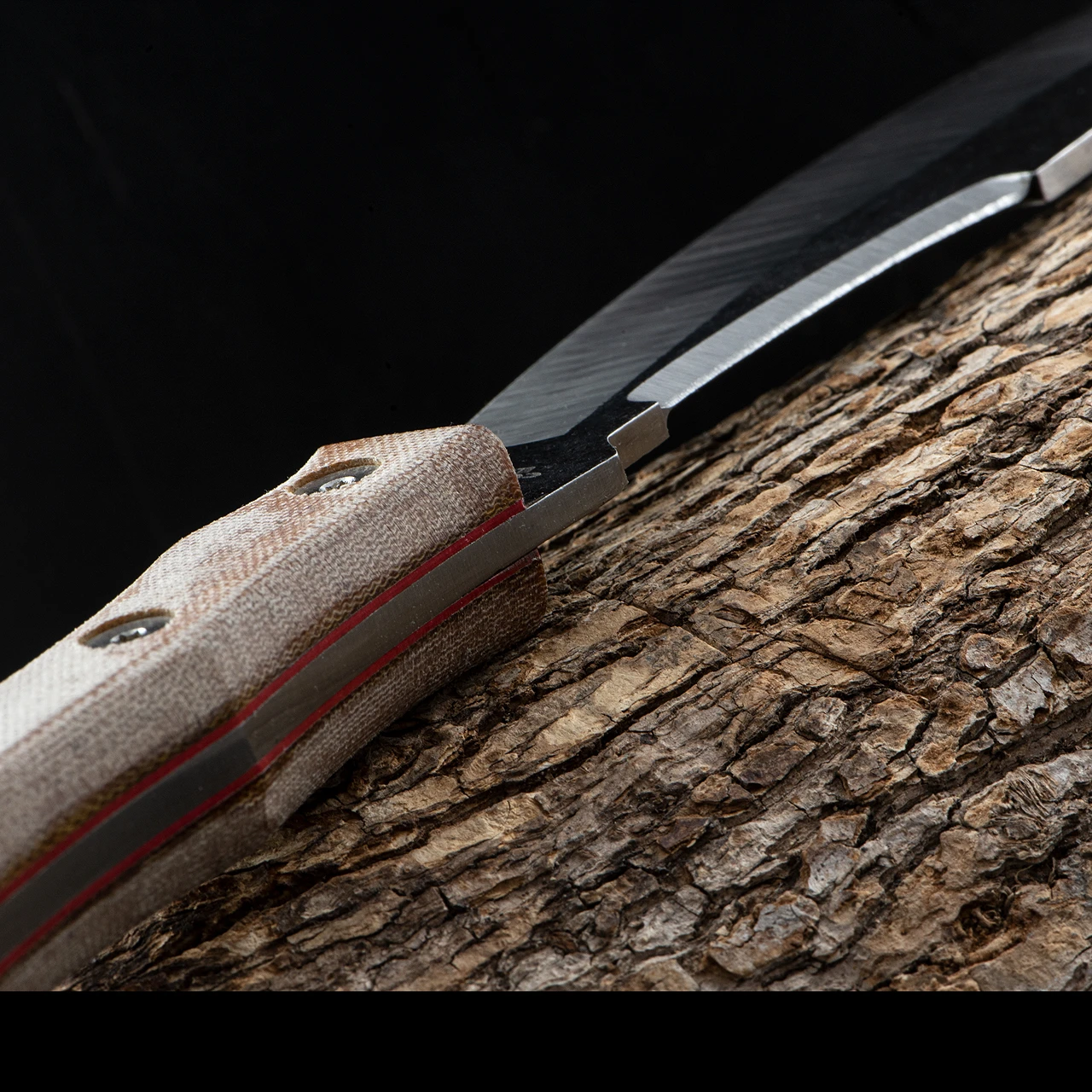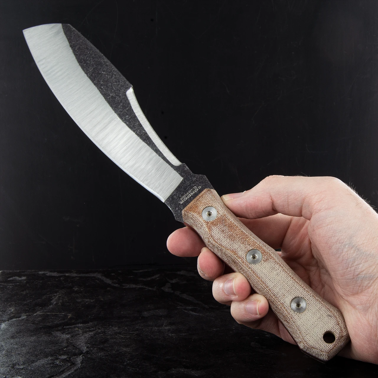 The Condor Mountain Pass Surveyor Knife features a stainless steel blade with a two-tone Condor Classic finish. It has a curved Wharcliff shape with a false edge running half the length of the blade. Despite the lack of ultra sharp edge it does, however, have enough “bite” to debark branches or get a spark out of a fire rod. The handle is made up of two slabs of tan canvas micarta with red liners. This extremely practical tool is supplied with a leather sheath.