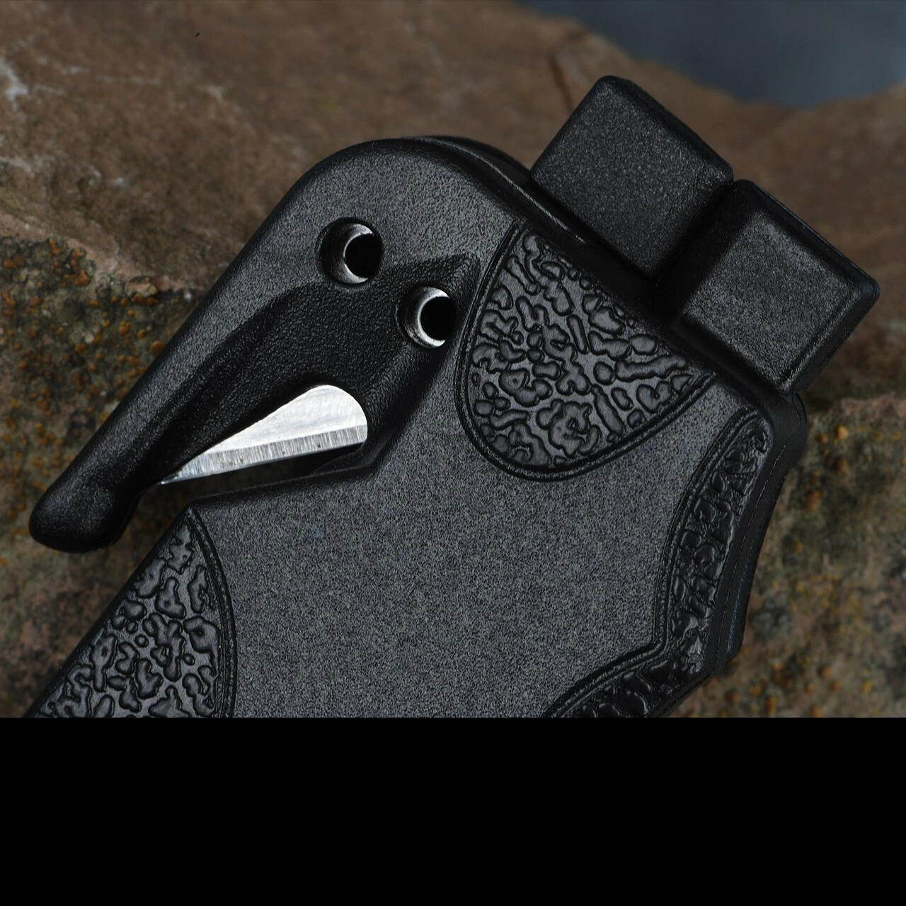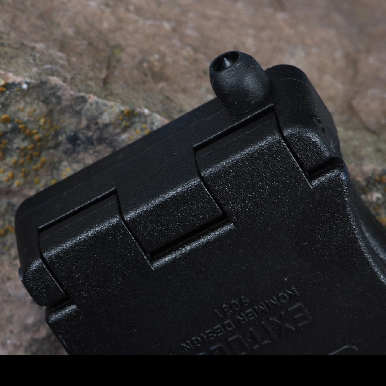 From his shop in Fargo, North Dakota, Russ designed the ExiTool to fit unobtrusively onto any standard seat belt with a simple folding clasp. It includes a seat belt cutter and a tungsten carbide window breaker with a protective covering. The seat belt cutter has been carefully designed so that is nearly impossible for even the smallest fingers to accidentally reach the blade. The blade is made of high-carbon stainless steel and will cut seat belts in one quick pull.
