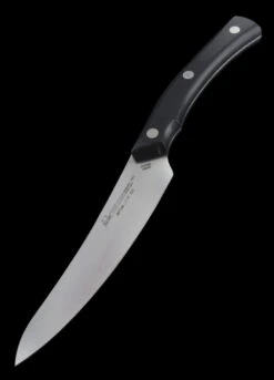 The Due Cigni Tuscany Knife Set includes a bread knife, a small kitchen knife, a Santuko and a large slicing knife. Each one uses high quality 4119 nitro-B stainless steel and has a smooth tactile olive wood handle.