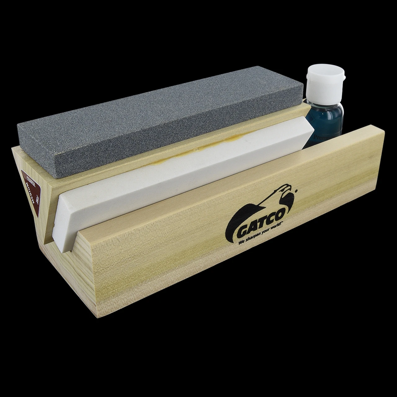 Each stone rotates and rests in the wooden triangular block for precise and graded sharpening. Can be used with oil or just water.