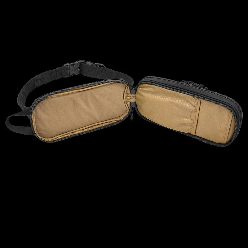 The pack-length is perfect for horizontal waist wear. Light aerated padding is quilted by military modular webbing for adding pouches/tools, etc. to the strap in either wear style. Top/bottom handles aid in pulling around or hanging up.