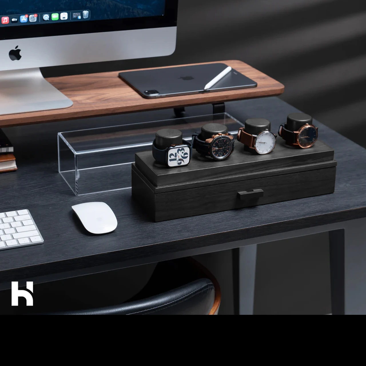 Holme and Hadfield have kept the functional features of a traditional watch organizer and valet tray, while combining it with a modern style case to display your favourite watches in a unique way.