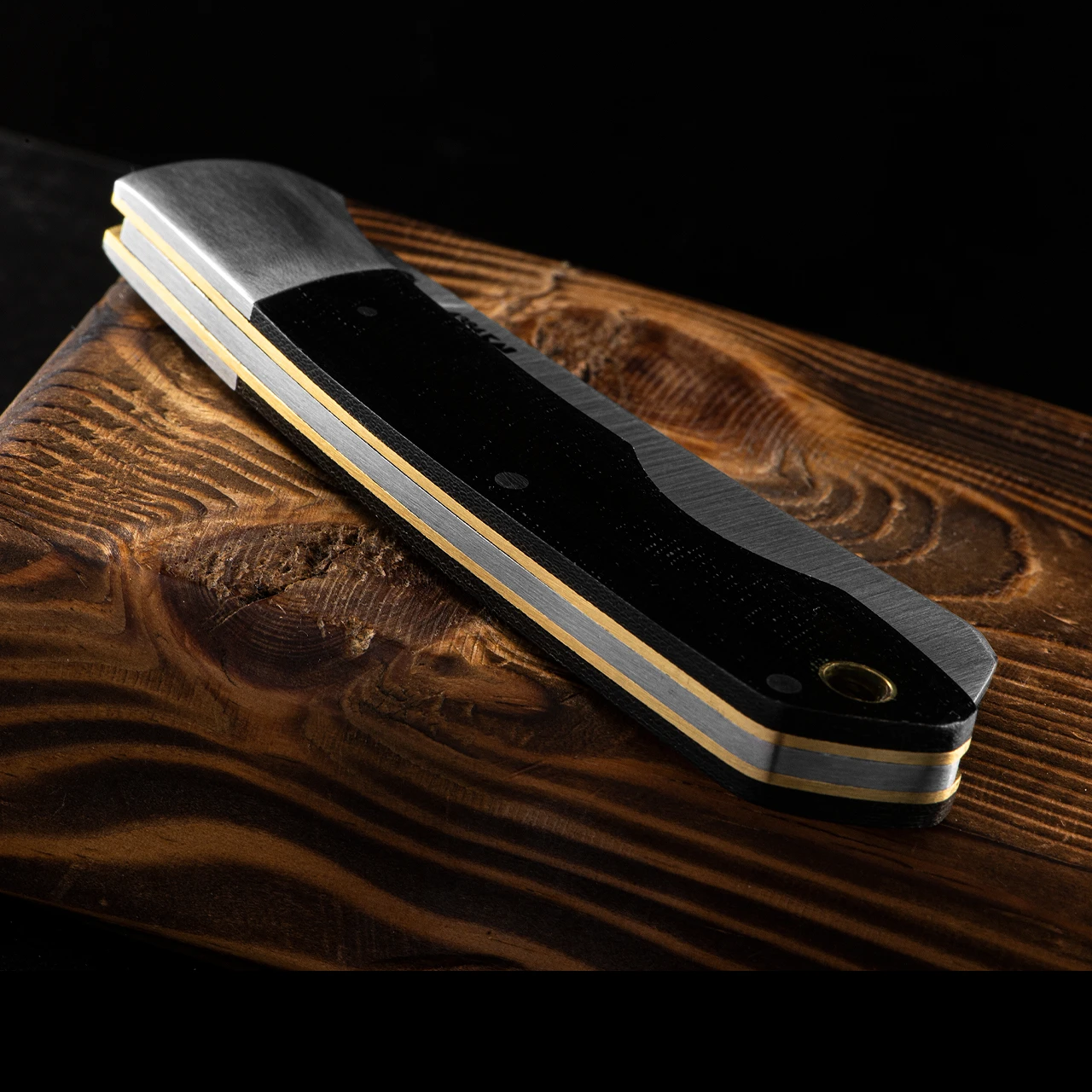 - Polished canvas micarta handle; steel bolster with brass liners