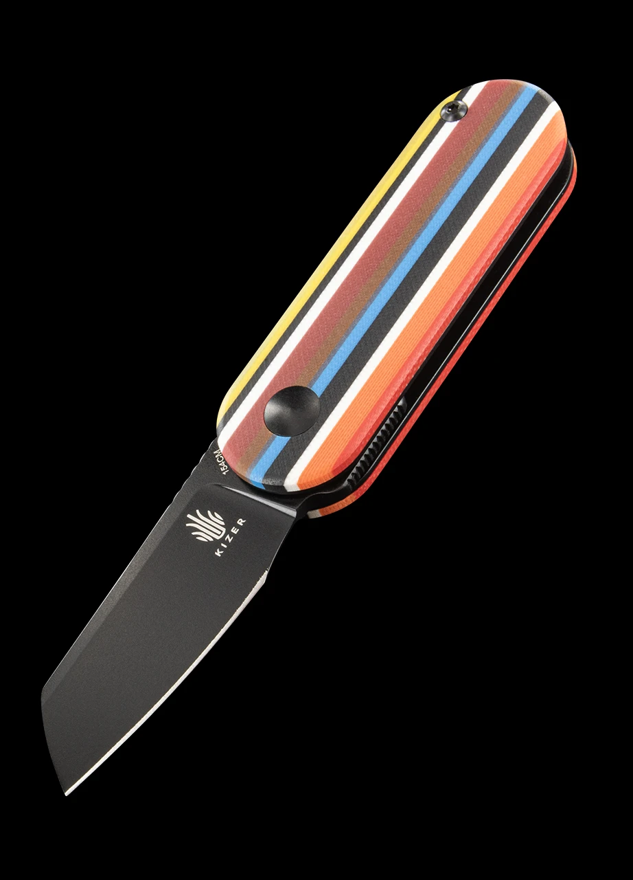 Part of the Kizer “Mexican Blanket” range, otherwise known as the Serape series, the Kizer Serape Mini Bay features a brightly coloured G10 handle modelled on the traditionally coloured weave of a Mexcian blanket.