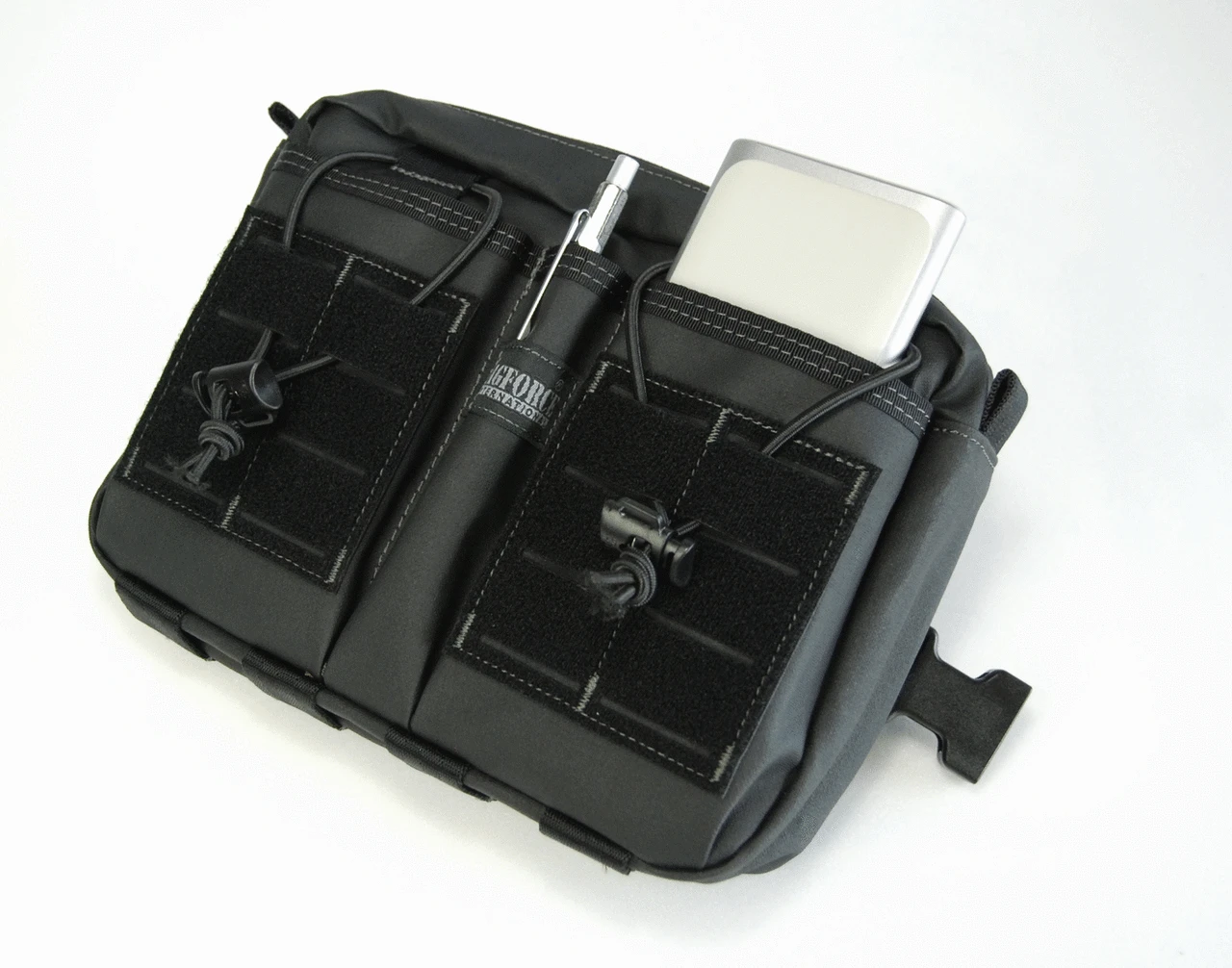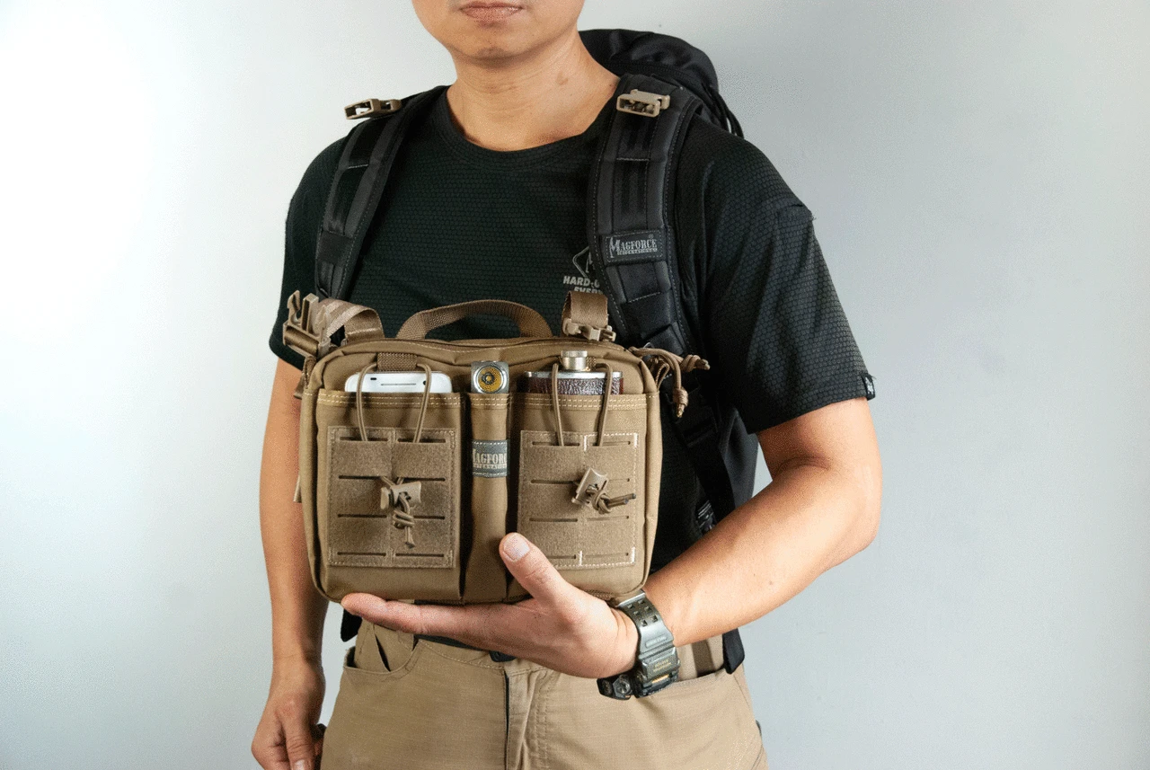 On the rear of the main bag, Magforce’s patented MOLCRO system enables the chest bag to be used alone, or Molcro’d on to another bag for increased versatility. Alternatively, the Magforce Entourage can be attached with its buckles onto the front of large Magforce backpacks as an expanded chest rig. Magforce’s quick-attach Mojave buckles allow simple attachment and removal.