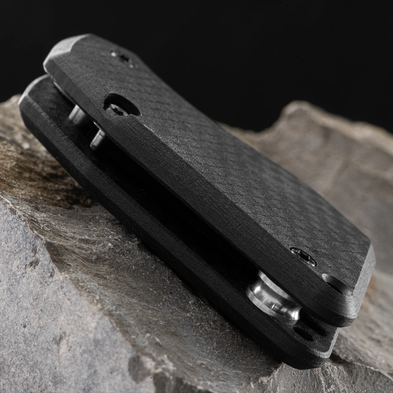 This model has a 1.75″ long CPM 154 chisel ground blade with matte carbon fibre handle and features
