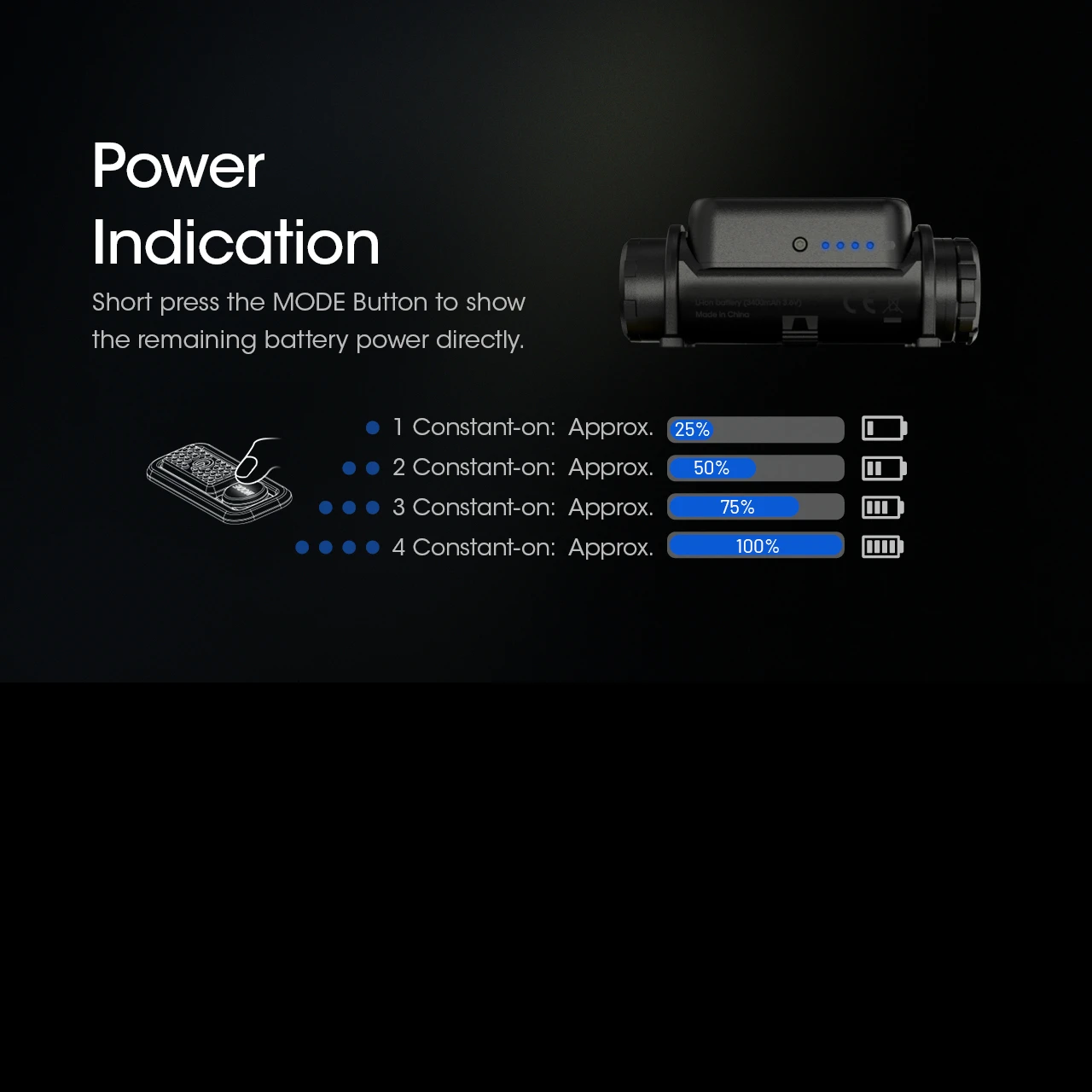 - Ultralow: 8 lumens – 165 hrs runtime