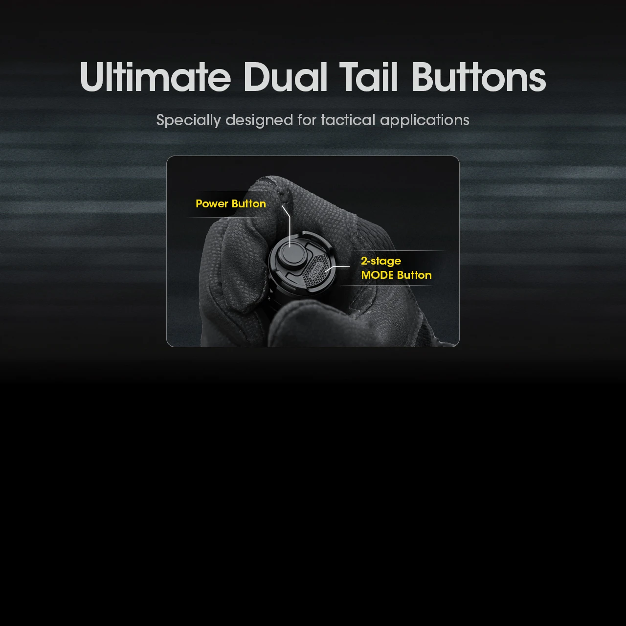 The latest addition to Nitecore’s SmartRing Tactical (SRT) series, the SRT6i has a rotating ring towards the tail end of the light which allows for smooth and simple output selection. On the tail cap are two switches: the power button which turns the light on and off and provides momentary illumination and the 2-stage mode button activates the randomly changing strobe mode.