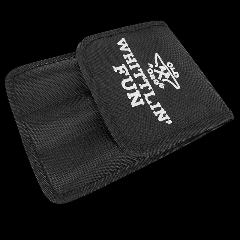Old Forge Three Piece Wood Carving Set includes one whittler, one detail knife and one chisel. Each one features a black finish high carbon steel blade and ergonomic natural wood handle. They are supplied in an embroidered black nylon belt sheath.