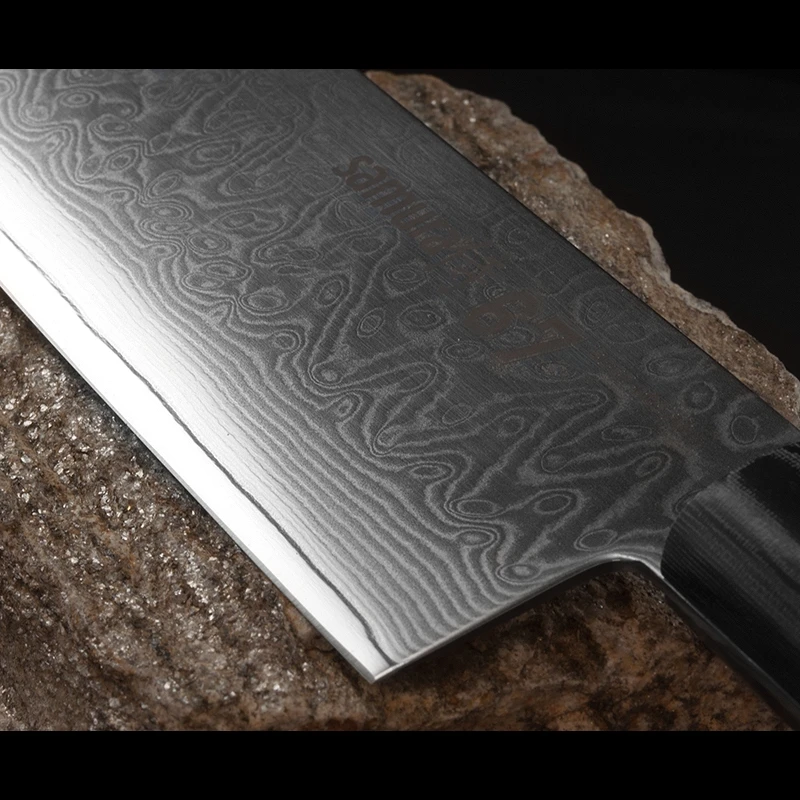 Crafted from 67-layer industrial Damascus steel, Samura bring their skill at combining the best components of Japanese knife steel with the finest design from European makers. This really is a high tech steel, with a Rockwell hardness of 61. This full tang blade provides excellent balance in the hand.