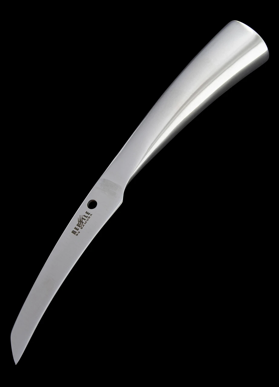 The handle is stainless steel too in an attractive “Reptile” style which will grace any kitchen both professional or domestic or any palette both meat eater or vegan.