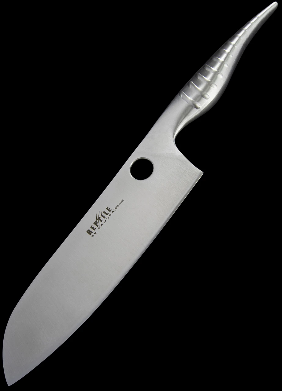 The Samura Santuko Reptile benefits from a AUS10 stainless steel, stain resistant blade. The handle is stainless steel too in a “reptilian” design which will fit right into the kitchen of veggies and meat-eaters alike.
